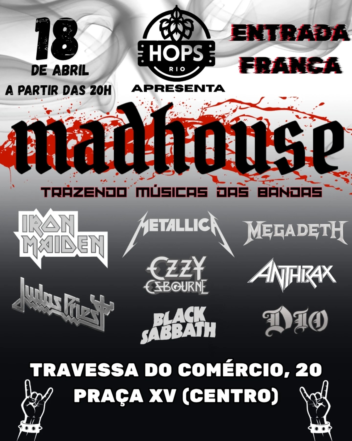 A 𝗠𝗔𝗗𝗛𝗢𝗨𝗦𝗘 ☢️ chega ao 𝗛𝗼𝗽𝘀 𝗥𝗶𝗼 para uma celebração ao que há de mais sagrado no Metal. Vamos invadir a casa com verdadeiros hinos do heavy e thrash metal! 🔥