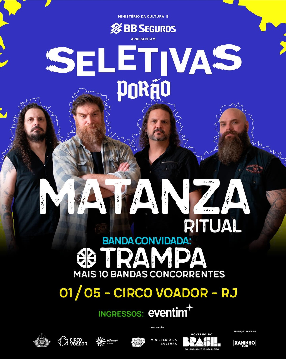 Matanza Ritual + Trampa + bandas selecionadas O Porão do Rock chega ao Circo Voador no dia 1 de maio com um show pesado do Matanza Ritual no palco, com participação da Trampa + bandas que vão disputar uma vaga pra tocar no festival ao lado de gigantes . E não é só show — as seletivas são uma das partes mais importantes da cena de rock no Brasil todo. É aqui que bandas do underground ganham espaço de verdade! Quem cola nessa? 👀🤘